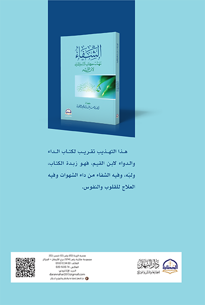 كتاب « الشفاء » هو تهذيب واختصار لكتاب « الداء والدواء » لابن القيم، وهو بمثابة خلاصة مركزة لهذا العمل القيم. يهدف الكتاب إلى تقديم العلاج الروحي للأمراض القلبية والنفسية من خلال الإيمان واليقين والتوبة، كما يعالج أثر الذنوب والمعاصي على القلب والروح، ويقدم توجيهات مستمدة من القرآن والسنة للشفاء من الشهوات والشبهات